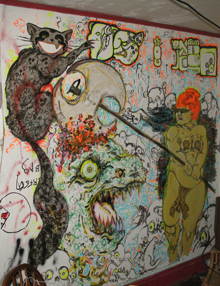 >> she who axes; axedancer new arrivals fight club house wall piece, mixed media, approx 11*15'2009