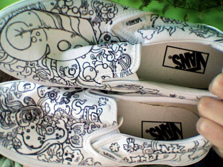 2007; one pair white canvas vans scribbled on via black sharpie.